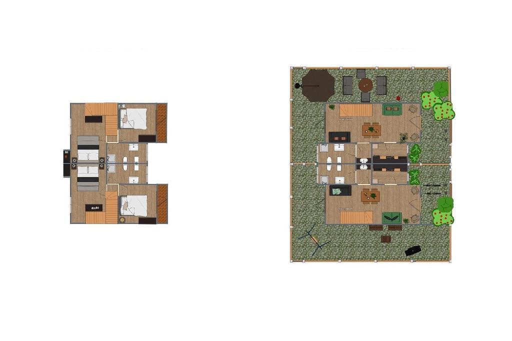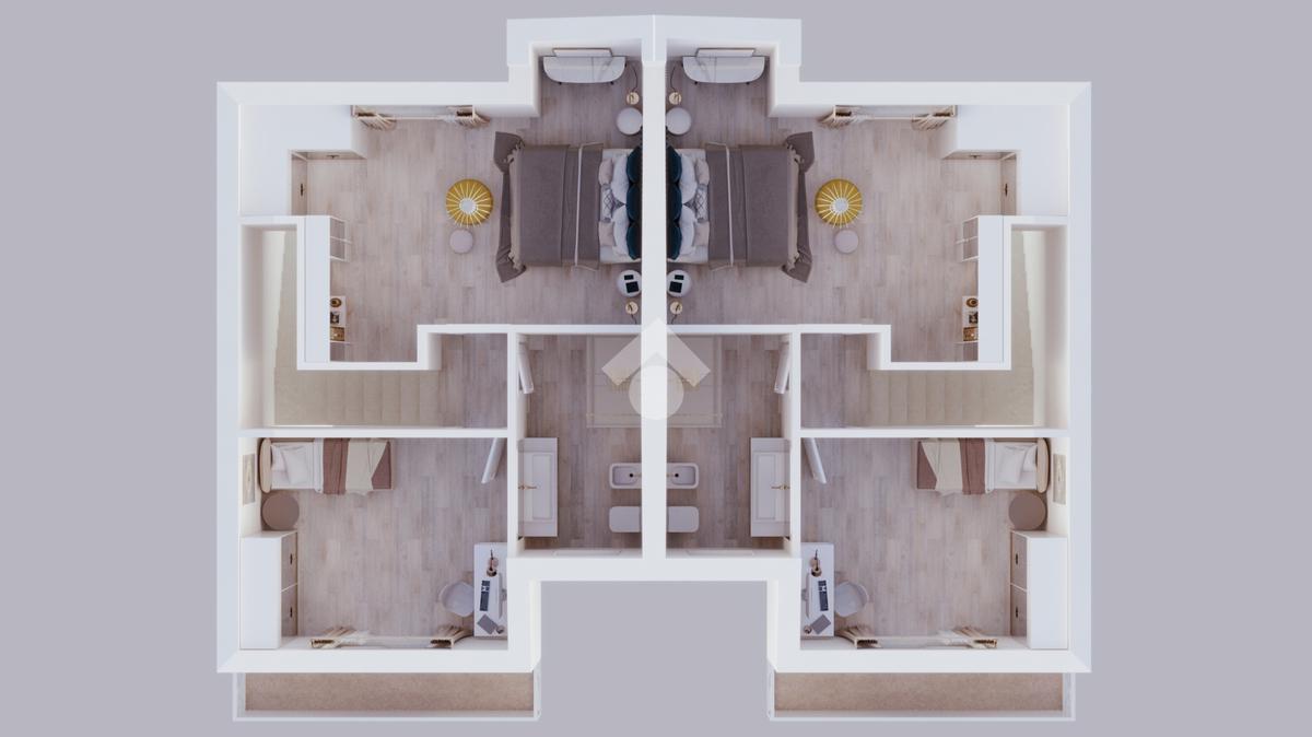 Ogni unità abitativa ha una superficie di 80 mq circa, suddivisa al piano terra tra Ingresso, soggiorno, angolo cottura riservato, bagno e accesso diretto al giardino con comoda veranda a livello. Al primo piano: Due camere da letto, entrambe matrimoniali, bagno e balcone.