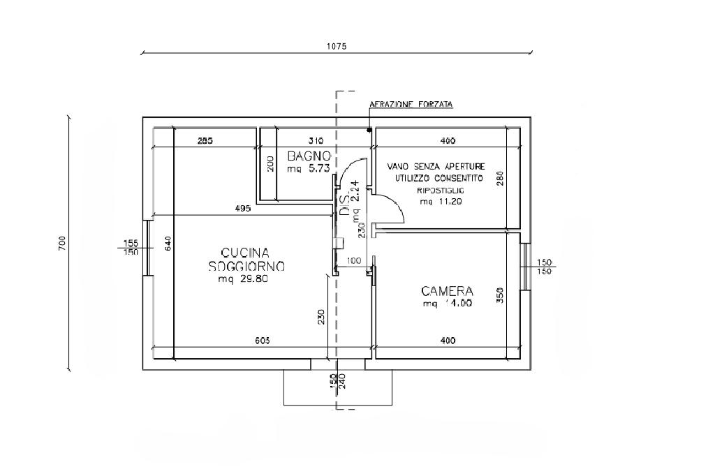 L'immobile, un rustico, si sviluppa interamente al piano terra verrà demolito e ricostruito dalle fondamenta e l'immobile consegnato al grezzo completo di tetto a falde. Come da progetto, l'immobile si dividerà internamente tra cucina, camera da letto, un grande ripostiglio, il disimpegno e il bagno.