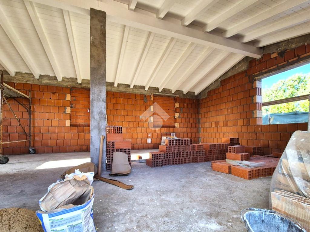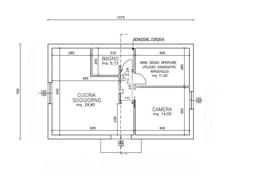 Si sviluppa interamente al piano terra e verrà consegnato al grezzo completo di tetto in legno con travi a vista, divisione interna e predisposizione degli impianti. Come da progetto, l'immobile si dividerà internamente tra cucina, camera da letto, un grande ripostiglio, il disimpegno e il bagno.