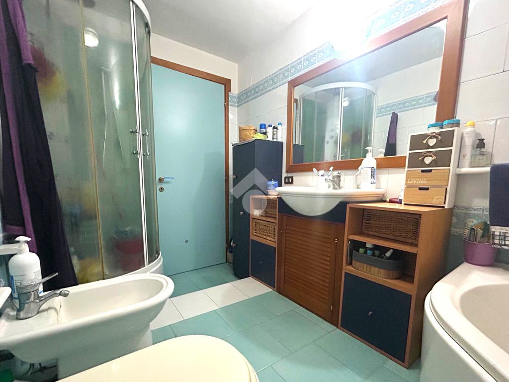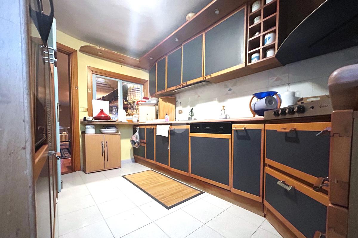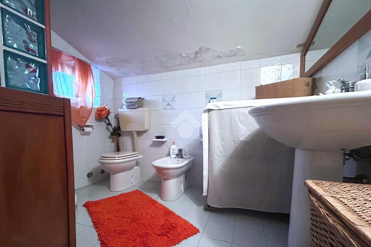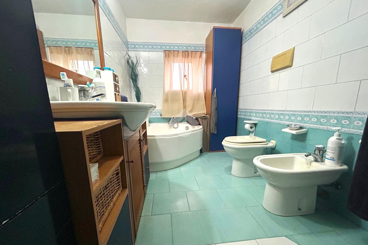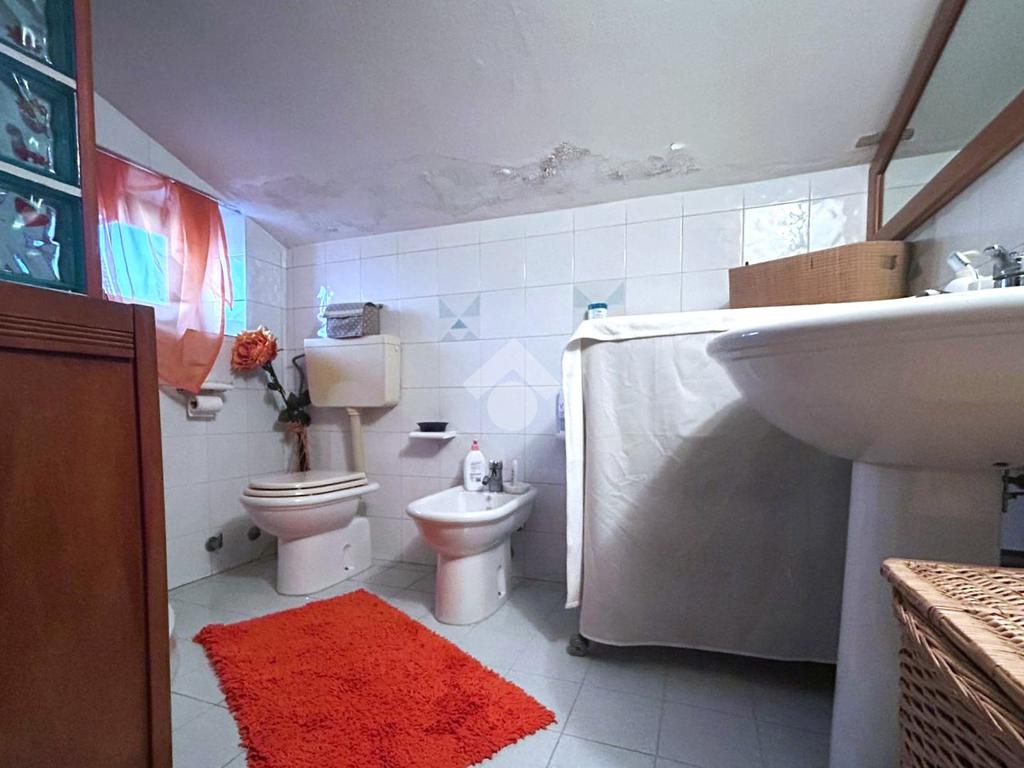 La cucina ci conduce su un secondo terrazzino, dove trova spazio un pratico ripostiglio, attualmente utilizzato come angolo lavanderia. Al piano è presente anche un bagno completo di vasca e doccia.