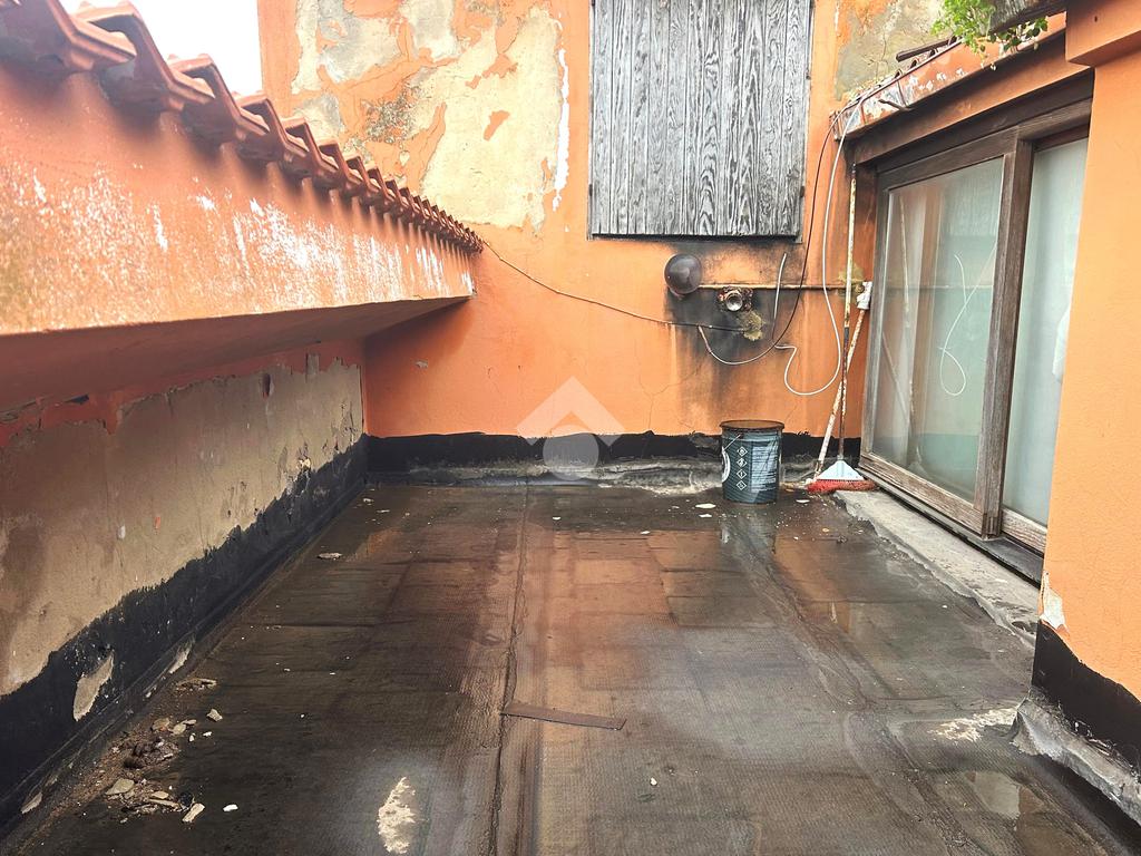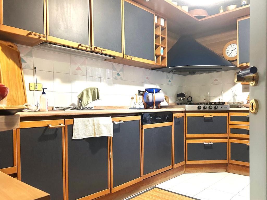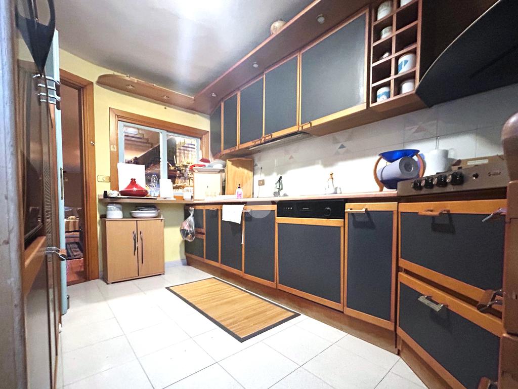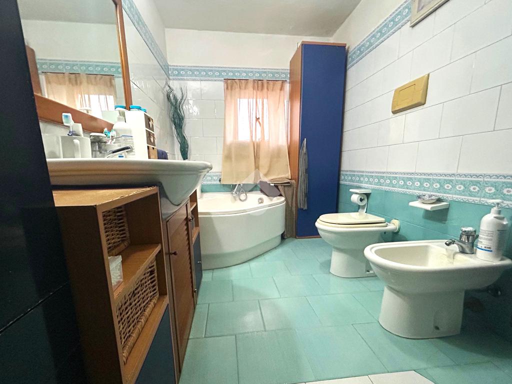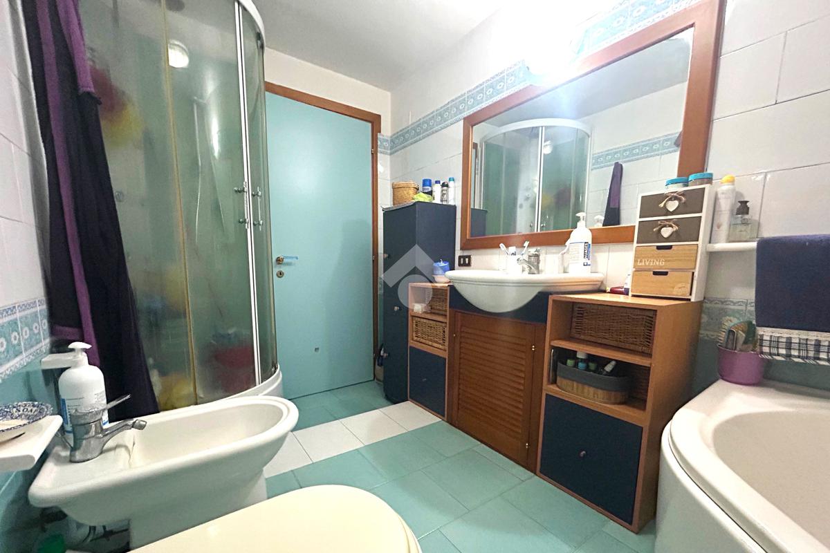 La cucina ci conduce su un secondo terrazzino, dove trova spazio un pratico ripostiglio, attualmente utilizzato come angolo lavanderia. Al piano è presente anche un bagno completo di vasca e doccia.