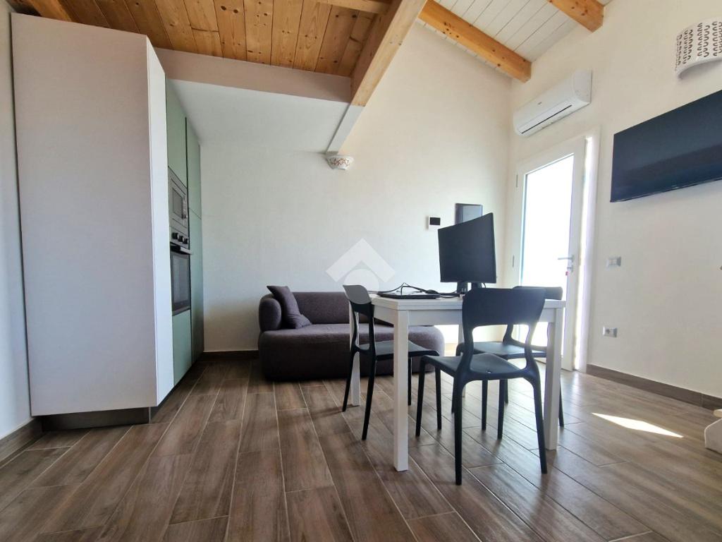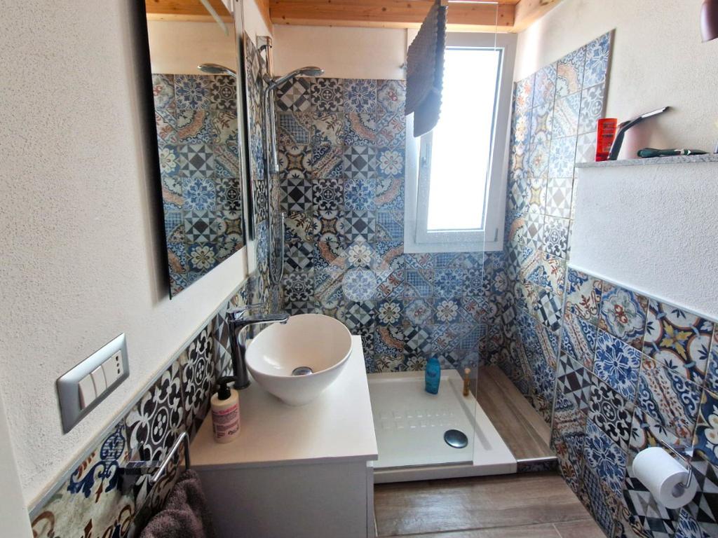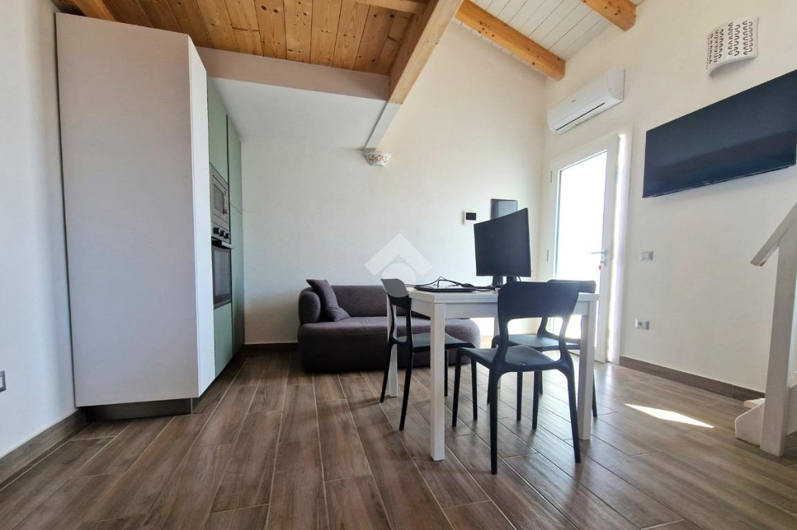 Dalla porta a vetri si accede in un ambiente luminoso e accogliente, dove la zona giorno si apre in un unico spazio ben organizzato. Sullo stesso livello si trova un bagno moderno e completo di doccia.