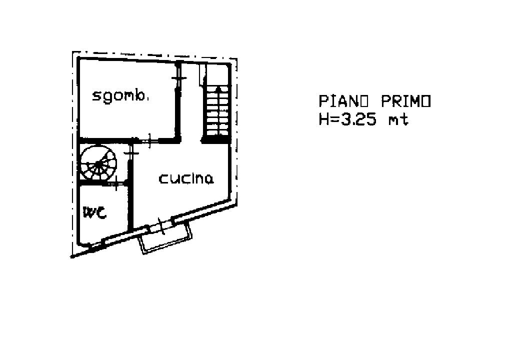 Dal piano terra, la scala conduce al primo piano, dove un altro disimpegno separa la porta dalla cucina/soggiorno, dotata di balcone, con vista su via Dante. Dal soggiorno si accede al bagno con doccia, anch'esso finestrato.