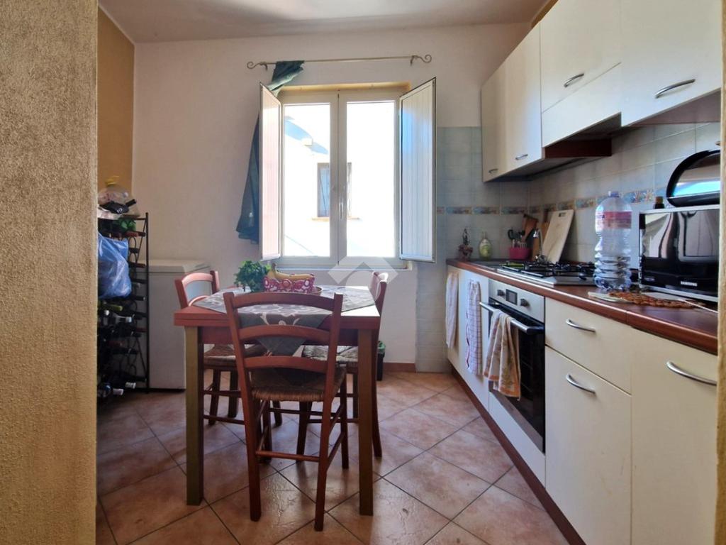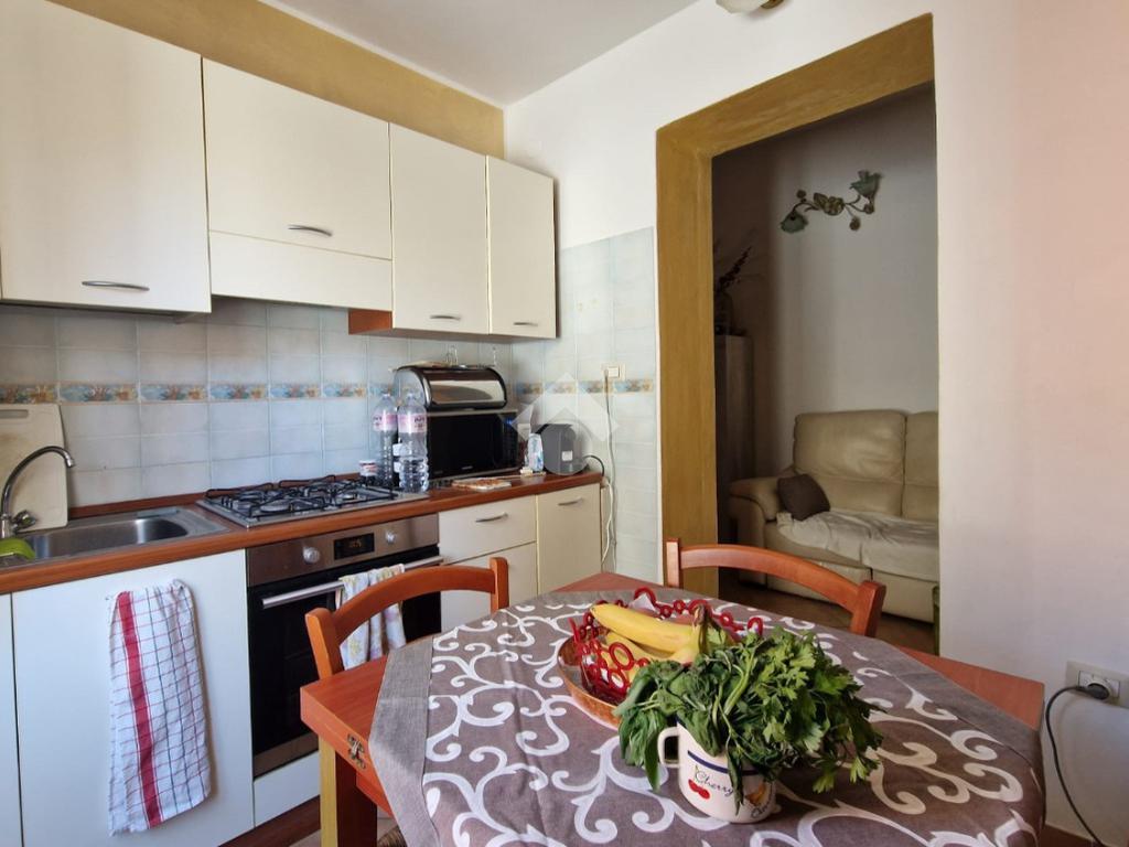 Dal corridoio, accediamo alla zona cucina accogliente, compatta ma ben organizzata, attrezzata per ogni esigenza quotidiana.