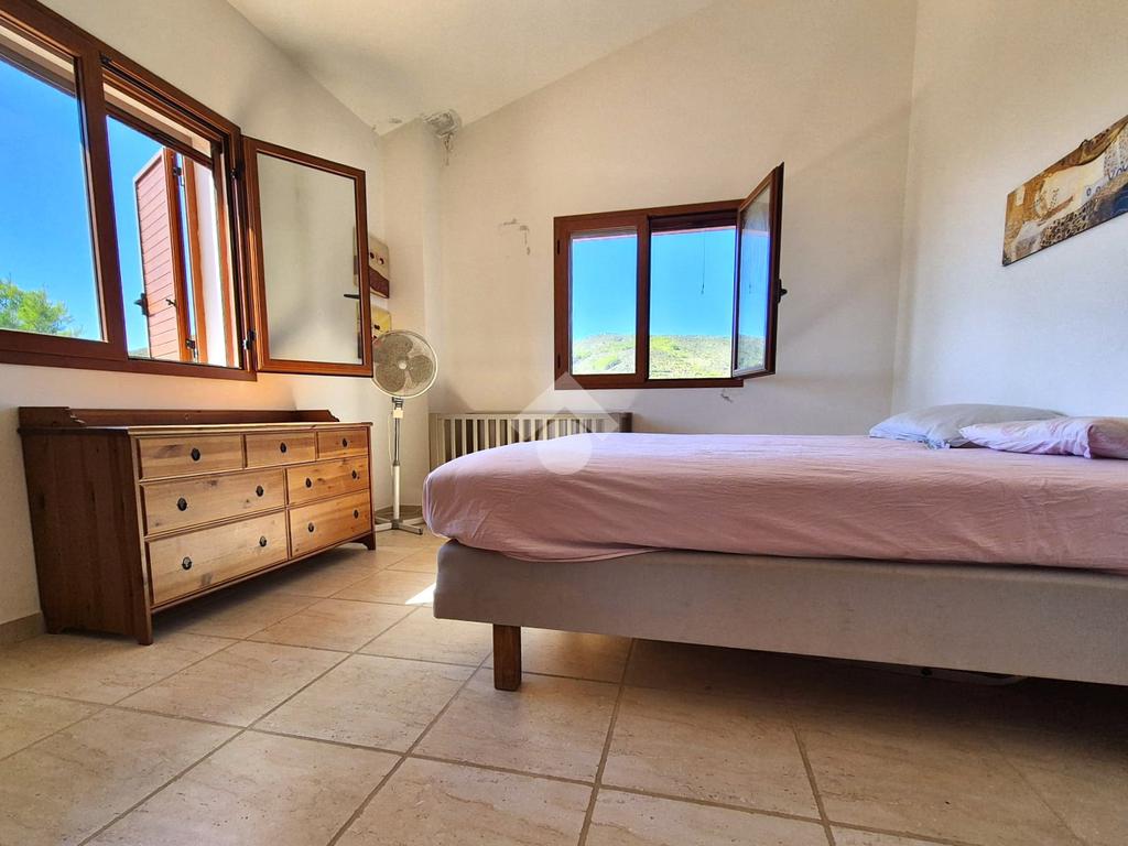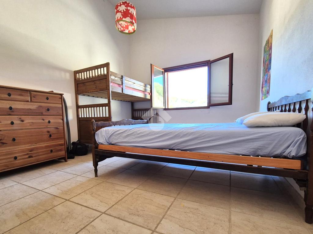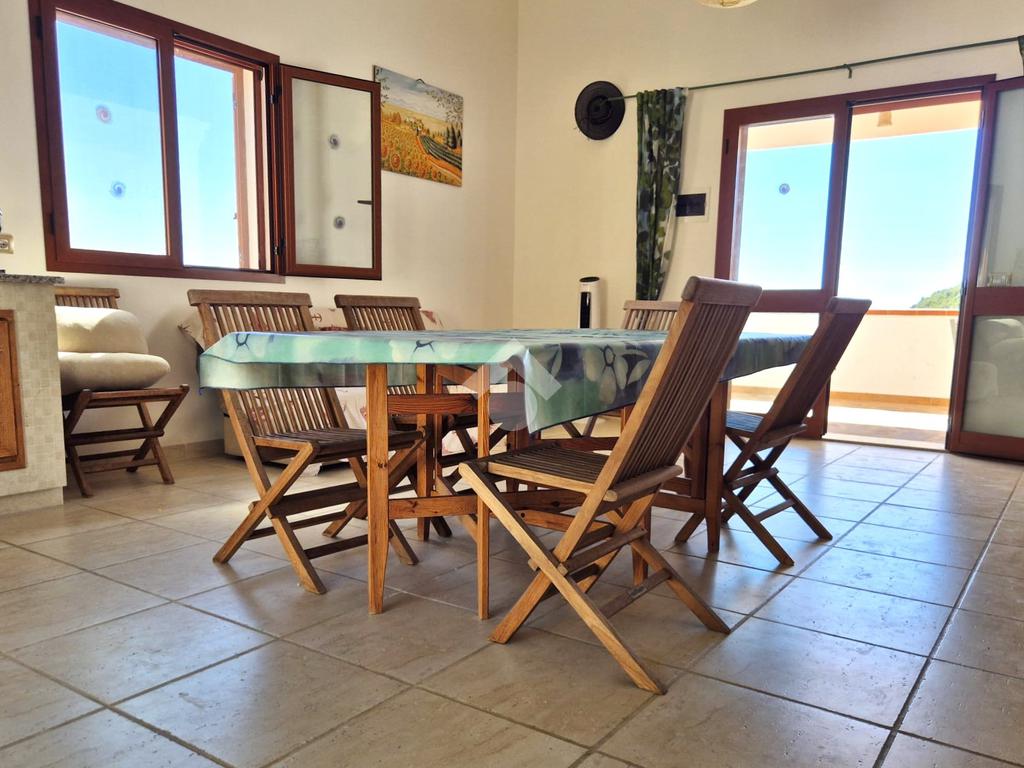 Il piano superiore, accessibile tramite ingresso indipendente e strada carrabile, ospita il secondo appartamento: una zona giorno con terrazzino panoramico che domina il paesaggio marino, due camere matrimoniali spaziose e un bagno completo di ogni comfort.